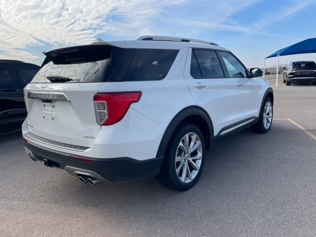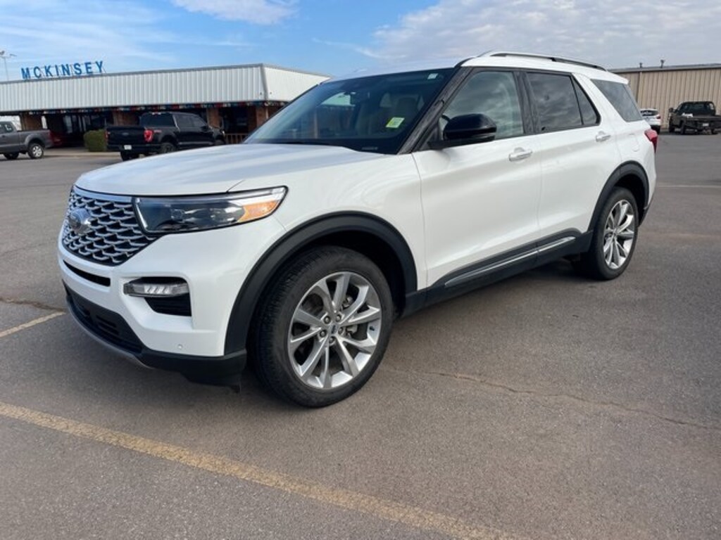 Star White Metallic Tri-Coat 2023 Ford Explorer Platinum 4WD 10-Speed Automatic 3.0L EcoBoost V6 Local Trade, Back Up Camera, New Tires, Navigation, Leather, Low Miles, Moon Roof, 4WD, 10.1" LCD Capacitive Portrait Touchscreen, 2 Additional Speakers, 3.31 Non-Limited-Slip Rear Axle Ratio, 4-Wheel Disc Brakes, ABS brakes, All-Weather 3rd Row Flr Liners w/Cap Chairs (DIO), Auto High-beam Headlights, Automatic temperature control, Brake assist, Class IV Trailer Tow Package, Dual front impact airbags, Dual front side impact airbags, Emergency communication system: SYNC 3 911 Assist, Equipment Group 601A, Exterior Parking Camera Rear, FordPass Connect, Four wheel independent suspension, Front anti-roll bar, Front Bucket Seats, Front dual zone A/C, Garage door transmitter, Heated door mirrors, Heated front seats, Heated rear seats, Heated steering wheel, Knee airbag, Leather steering wheel, Low tire pressure warning, Memory seat, Navigation System, Occupant sensing airbag, Overhead airbag, Power door mirrors, Power Liftgate, Power passenger seat, Radio: B&O Sound System by Bang & Olufsen, Rear air conditioning, Rear anti-roll bar, Remote keyless entry, Security system, Speed-sensing steering, Steering wheel memory, Steering wheel mounted audio controls, SYNC 3 Communications & Entertainment System, SYNC 3/Apple CarPlay/Android Auto, Technology Package, Telescoping steering wheel, Tilt steering wheel, Traction control, Twin Panel Moonroof, Ventilated front seats, Voice-Activated Touchscreen Navigation System, Wheels: 21" Bright Machined-Face Aluminum.